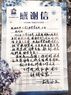 广州游客小王时隔7年再访冰城,在客服中心取暖时随口说自己没约到摩天轮,工作人员小白及时援手帮他完成预约。小王在留言中称赞小白“有冰雪之光”。游客小Q和甜瓜公主则在留言中点名感谢小姜、小白等工作人员,“因为有这样的工作人员,游玩体验才能得到保障”。服务中心墙上悬挂着“尽职尽责暖人心,拾金不昧显真情”等锦旗,都是游客送来的。