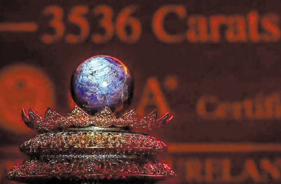 一枚3563克拉的紫星蓝宝石近日在斯里兰卡首都科伦坡公开展示,重量据称为同类宝石之最,预估售价在3亿到4亿美元。