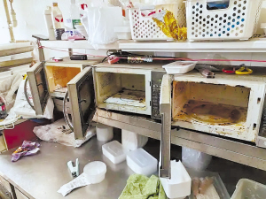 随后,记者又与执法人员来到一家“小碗菜”外卖门店。灶台黢黑一片,地板粘脚且散落着多个烟头,三台微波炉内沾满了黄色黏液,电饭煲正加热一锅“红烧排骨”料包。而这家店却在外卖平台上宣称“大厨现炒 拒绝预制菜 新鲜食材”。所谓的“现炒”就是“微波炉加热”,有顾客在其外卖平台店铺上点评,“打包盒是热的,菜是凉的,一看就知道是微波炉加热”。记者到此只片刻工夫,便有十几位骑手来此取餐。截至该店被检查时,其外卖平台页面显示“月售900+”。