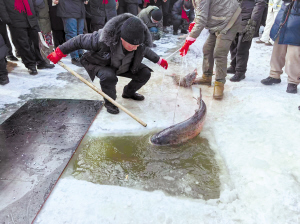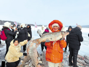 从主城区赶来的刘女士拎着一条刚捕捞上来的大鱼告诉记者:“孩子以前只是在课本上了解过冬捕,今天带他到现场看,又听了专家讲解的历史故事,收获真不小。”