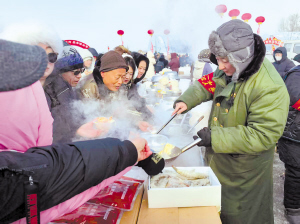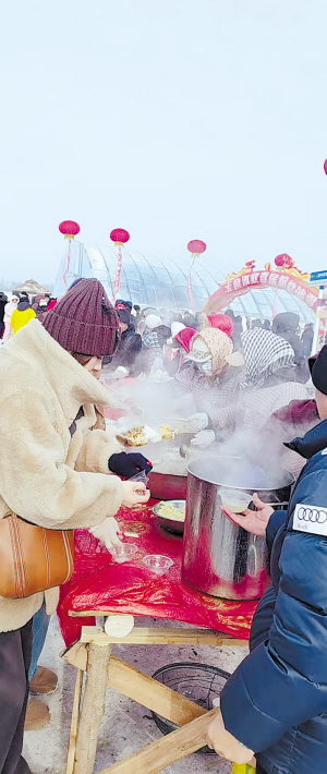 在现场冬捕火热进行的同时,免费团圆宴已准备就绪,市民、游客和当地乡亲排起了长队,一同享受冰雪季“年嚼裹儿”。