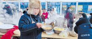 现场支起的10多口大铁锅热气腾腾,锅里是酸菜炖血肠、铁锅炖大鹅、白菜炖冻豆腐、尖椒干豆腐,还有羊肉火锅、鱼汤等。从河北唐山来哈尔滨旅游的朱先生说:“从没见过这么多人吃席的场景,这里天冷人热情,美食更好吃。”从主城区过来的郑女士说:“在这里才感受到什么是乡村过大年。”