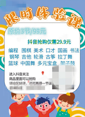 “1元体验两小时羽毛球”“9.9元试听英语课或乐器培训、编程入门”“免费体验精品课程”……随着体验经济的兴起,类似的宣传语在不少培训商家广告中时常出现。从乐器课到瑜伽课,从短视频剪辑课到少儿英语课,各式各样的低价体验课程涌入消费者视野。然而,记者调查发现,一次充满期待的体验课可能“换来”骚扰营销电话、对课程质量的失望,甚至可能陷入费用纠纷。当消费者试图维护自身权益时,可能面临维权成本不低的“拉锯”战。