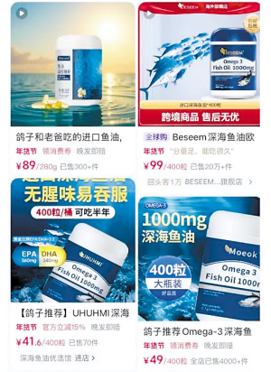 多款包装相似的鱼油均宣称为“白鸽推荐”。 “躺下睡不着、半夜容易醒、脑袋晕胸口痛都吃它”“给血管洗澡”“固发养发,呵护头发健康”……直播间里,主播们用极具渲染力的话术,将鱼油包装成包治百病的“神药”,并宣称自家鱼油在纯度和有效成分上“全网领先”。近期,记者从某直播电商平台购买多款热销的“深海鱼油”,送检后发现,3款“深海鱼油”Omega-3含量低于10%,2款关键功效成分DHA更是未被检出,与宣传存在巨大差距。多位受访专家认为,如此异常的检测数据可能意味着产品原料就是植物油,或因为生产工艺过于低劣导致有效成分完全流失。