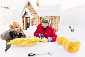 彩色冰屋前,冰雕师正在雕琢彩冰玉米、南瓜。
