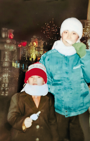 爱人拿着相机忙个不停,给大家拍照,给姨婆和婆婆老姐俩拍了许多合影,又给每个人单独留影。有一张我和儿子的合影至今难忘:母子俩站在一座高高的冰雕前,天空中正绽放着璀璨夺目的烟花。我围着长长的白围脖,儿子戴着小红帽,手里还拿着一根冰棍。这张合影拍出了冰城人的特点:越冷越吃冰。
