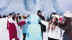 “5、4、3、2、1,启动!”夜幕降临,在全场观众高昂的倒数声中,6位北京游客用手心同时触碰主塔点亮开关。刹那间,这座由万千块冰砖精心雕琢而成的主塔由下至上缓缓点亮,冰与光完美结合,如梦似幻,蔚为壮观。冰雕的剔透与灯光的灵动相互交织,勾勒出主塔恢弘的轮廓,仿佛将人们带入奇幻的冰雪梦境。