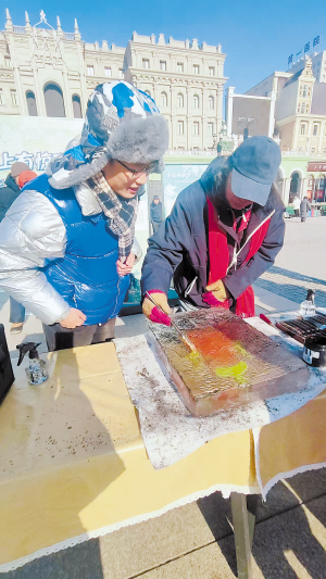 本报讯(记者 张鸣霄 文/摄)2日,索菲亚景区广场上,游客们被一幅幅现场制作的冰版画吸引。这场“冰版画新年·马上有惊喜”文化体验活动,既是对即将到来的马年的期许,也给游客们带来冰雪与艺术碰撞的惊喜。