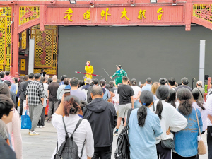 试探的结果令人惊喜。在枫叶小镇奥特莱斯的比萨广场,经典武戏《三岔口》刚一上演,便吸引了里三层外三层的观众。演员们凭借精湛的武功和幽默的肢体语言,让匆忙的购物之旅变成了沉浸式的艺术体验。带孩子逛街的王女士很开心:“孩子看得目不转睛,这比在剧院里看演出更亲切,让我们感受到了传统文化的魅力。”