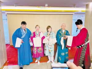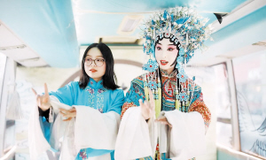 “霓裳京运巴士”上,观众正在体验京剧的服装、动作。