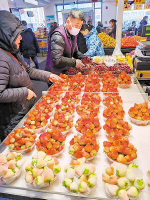 在香坊区安埠商圈一家地下超市内,草莓销售区摆满了新鲜饱满的九九草莓,鲜红的果实带着翠绿的果蒂,吸引不少市民驻足挑选。“今年真便宜呀,往年这个时候都得十多元钱一斤,今年不到10元。”正在这里挑选草莓的王阿姨一边将草莓放进商家提供的草莓购物盒中,一边笑着说,家里人都爱吃草莓,往年春节前舍不得多买,今年价格实惠,多买点,还盼着春节期间能保持这个价位。