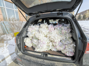 李秀玲指着塞得满满的汽车后备厢说:“80个饺子装一袋,再配上糖果、白面、豆油、苹果、红袜、毛毯和对联,就是一份‘暖心年货大礼包’!”