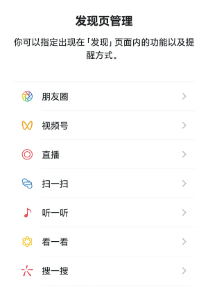 此时,页面会列出所有发现页功能:朋友圈、视频号、直播、小程序、游戏、购物、搜一搜等。依次点击不用的功能,并将其关闭,只保留朋友圈、扫一扫、搜一搜这些常用功能即可。