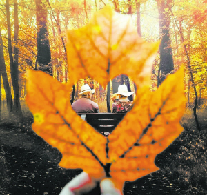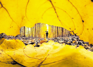 如果叶片够大,还可以把叶子像卷纸一样卷起来,放在镜头前,再让人物站远一些,置身于卷叶形成的框架中,同样能拍出“窥视”效果。