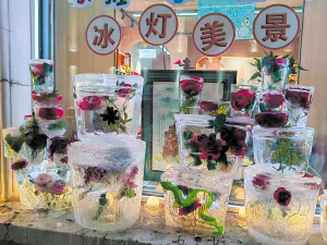 本报讯(记者 杜菲菲 文/摄)近日,中华巴洛克历史文化街区“嘉驹文创”店窗边,10余个由商家手工制作的“玫瑰冰灯”亮相,以其古朴形态与浪漫设计,吸引往来游人驻足欣赏。