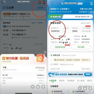 例如3月28日,从上海飞往北京支付价格为675元,而航旅纵横显示“含税票价”为480元,相差195元;4月7日,从上海飞往三亚支付价格为1210元,航旅纵横显示“含税票价”为1020元,相差190元;5月22日,从深圳飞往北京支付价格为3915元,航旅纵横显示“含税票价”为3720元,相差190元。
