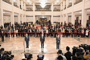 3月4日,全国政协十四届四次会议首场“委员通道”集体采访活动在北京人民大会堂举行。新华社发 3月4日下午,全国政协十四届四次会议首场“委员通道”集体采访活动在人民大会堂举行,9位全国政协委员走上“委员通道”,接受了记者的集体采访。