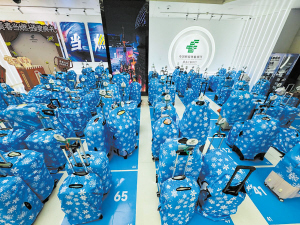 旅游旺季,银行行李寄存处一片蓝。