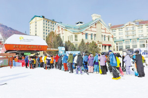 来自温州的王先生正和朋友准备挑战中级道,他边调整固定器边告诉记者,他听说春雪节启幕就立刻就订机票来到亚布力,“这里的雪道专业,风景更美,头顶是湛蓝的天,两边是郁郁葱葱的树林,滑起来既刺激又享受,所以迫不及待就来了。”