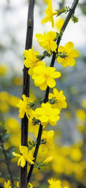 3.找对角度:如果只是水平拍摄迎春花,枝条就会显得软塌塌、杂乱无章,没有立体感。让迎春花的枝条向上延伸,避开地面杂物,既能突出枝条的灵动,又能拍出立体感,使画面更有层次;顺着枝条的方向侧着拍,让枝条自然舒展,不用刻意整理,杂乱中带着自然感,反而更有春日的灵动气息。