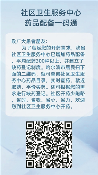 小程序 本报讯(记者 董彤)近日,记者从市卫生健康委获悉,为优化医疗资源配置,破解大医院便民门诊拥挤、群众购药不便等问题,哈尔滨市正式推出社区卫生服务中心药品配备“一码通”小程序,以数字化服务打通基层用药“最后一公里”,引导市民就近购药、便捷取药。