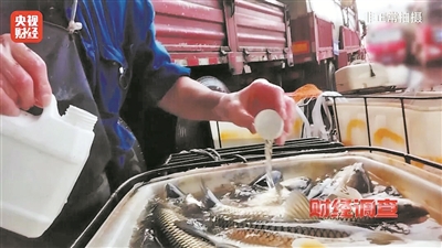 在运输环节上,记者看到工人往装活鱼的桶里加一瓶盖液体搅拌后,活蹦乱跳的鱼瞬间安静瘫软。工人手中的这些液体瓶上写着“鱼护宝”,鱼用安定剂,成分丁香酚,属无生产日期、无生产厂家、无生产许可证的“三无”产品。一家生产丁香酚的厂家告诉记者,丁香酚在鱼体内完全代谢至少需48小时。