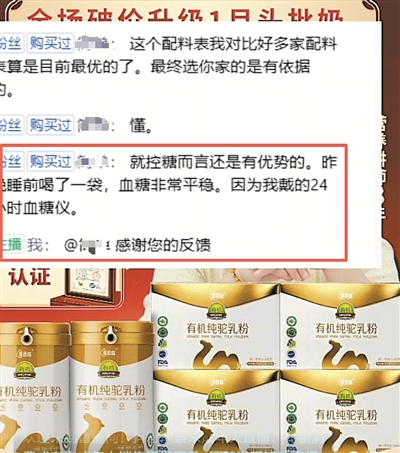 老年人是驼奶粉消费主力,其中不少患有“三高”等基础疾病,部分品牌便将宣传焦点指向这一领域。日前,在“源西域”官方旗舰店直播间,面对用户“喝驼奶能否调节‘三高’”的询问,工作人员毫不迟疑地回答:“是。”主播还分享了一个案例:西安一位61岁阿姨每天喝两杯,3个月后血糖控制效果明显,“这些问题都没有了”。