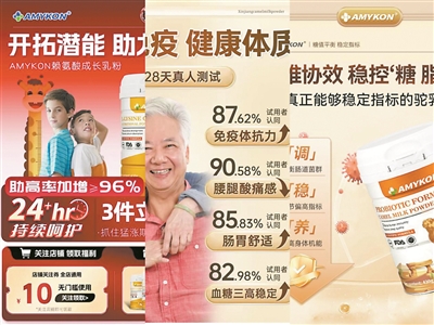 此类宣传不止于直播间。在电商平台上,不少品牌将驼奶粉包装成具有特定功效的“功能性食品”。GLGFAS的一款儿童驼乳粉宣称可以“助长身高”“补脑辅助拔高”;AMYKON(品牌中文名:安美心)旗下驼乳粉则承诺对孩子“智高双补”,同时能够“稳控‘糖脂压’”,是“真正能够稳定指标的驼乳粉”。优卓旗舰店的“臻牧驼”新疆驼奶营养粉更打出“数据牌”:宣称经28天真人测试,87.62%的试用者认同免疫体抗力提升,82.98%认同血糖“三高”稳定。