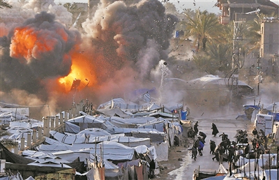 视频画面显示,在加沙地带中部城市代尔拜拉赫,炸弹落在难民营人员密集处,随后发生剧烈爆炸,难民无处可躲。空袭留下巨大弹坑,建筑沦为废墟。