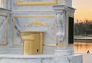 这个“王座”外观为仿大理石材质,点缀着金色装饰浮雕,而本应安放座椅的位置则是一个金色的马桶,铭牌写着“国王的宝座”。