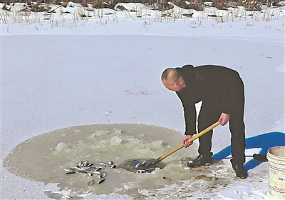 上一次在这个季节采访马永军,他约记者在木兰县建国乡利勤村西山脚下一处鱼塘碰面。今年也不例外,依旧是这块200亩的鱼塘边,56岁的马永军攥着沉甸甸的冰镩,在没化透的鱼塘冰面上凿开一个窟窿。他搓了搓冻得发红的粗糙双手,弯腰把一桶碎鱼虾撒在冰水交界处。没过多一会儿,上百只巨大的苍鹭盘旋而下,它们不怕这个穿着破旧黑棉袄的人,甚至有几只直接落在他十步开外,悠然地啄食起来。“你看那只脑袋上带一撮毛的,去年被猎夹伤了腿骨,我给治好放飞的。今年它出息了,成了带头的,我一撒食它第一个飞下来。”老马指着鸟群,眯起的眼角挤满了深深的皱纹。