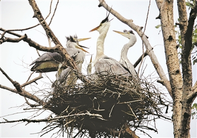 苍鹭在鱼塘周边树上筑起鸟巢。