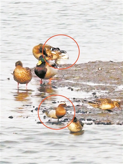 “当时距离太远了,肉眼根本看不清,只觉得是一群普通的野鸭在水里游。”吴戟告诉记者,3只白眉鸭完全混迹在鸭群里,若不仔细分辨,根本察觉不到异样。直到回家整理照片,将画面放大后,他才惊觉这几只鸭子长相不一般:其中一雄一雌与绿头鸭结伴,雄鸟头顶是浓郁的巧克力色,一道又宽又长的白色眉纹从眼部一直延伸到后颈,格外醒目;雌鸟眉纹则浅淡许多,低调地混在鸭群中。不远处,还有一只雄性白眉鸭独自与赤颈鸭嬉戏,模样十分灵动。