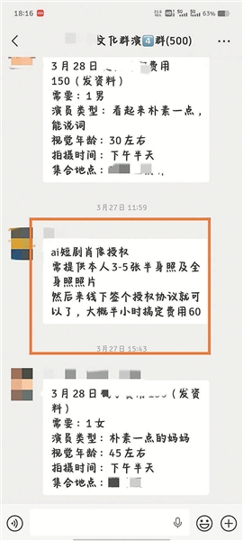 一位群演告诉记者,群演群中已出现六十元的“AI短剧肖像授权”。 如果不是看到朋友发来的AI短剧截图,汉服妆造博主“白菜”不会发现,自己竟在虚拟世界里,成了“猥琐好色”的反派配角。屏幕里,白菜看到另一个“自己”,五官、脸型、妆容都和自己几乎一模一样。这样的AI“盗脸”事件,并非孤例。只需要几张照片,便能精准地将一个人的面孔“抠”出,进行一些调整,就能“缝合”进视频生成。在成本与效率被同时压缩的生产逻辑下,一部AI真人短剧的算力投入能被控制在数千元,制作周期甚至不足5天;一些制作方往往直接从网络搜集图片作为生成参考。在现有法规中,肖像权通常以“是否可识别”为判断标准。但在AI生成语境下,当“像”与“不像”之间出现灰色地带,侵权认定也随之变得复杂。