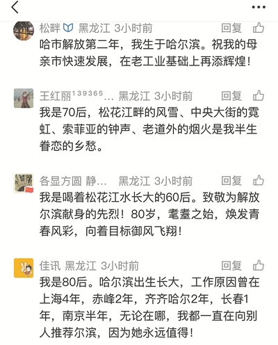 一位“80后”的告白,满是游子对故乡的牵挂与骄傲:“我是‘80后’。在哈尔滨出生长大,工作原因曾在上海4年、赤峰2年、长春1年、南京半年,无论在哪里,我一直都在向别人推荐‘尔滨’,因为她永远值得!”从告白中可以看到,无论走多远,冰城永远是游子们心底最柔软的那部分。