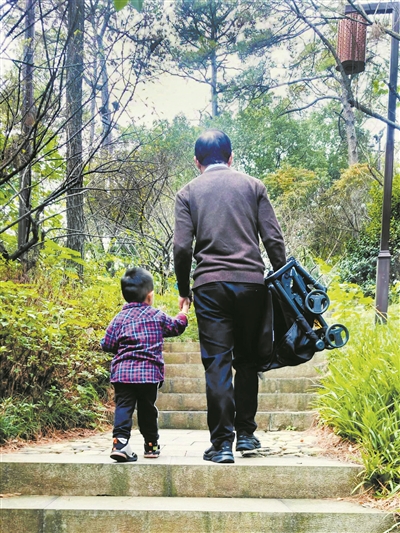 爷爷带着小孙子去爬山。