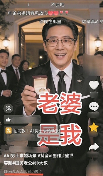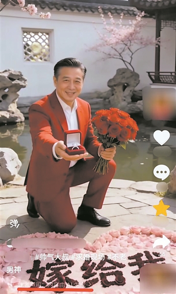 “AI霸总”在视频中跪地求婚,让不少老年粉丝信以为真。(网络截图) 短视频平台上,身着正装、开着豪车、戴着金表的“儒雅霸总”,张口“姐姐”、闭口“想你”,嘘寒问暖甚至下跪求婚……这些“霸总”其实是AI生成的,但不少老年粉丝信以为真,不仅身心健康受到影响,还存在被诈骗的风险。