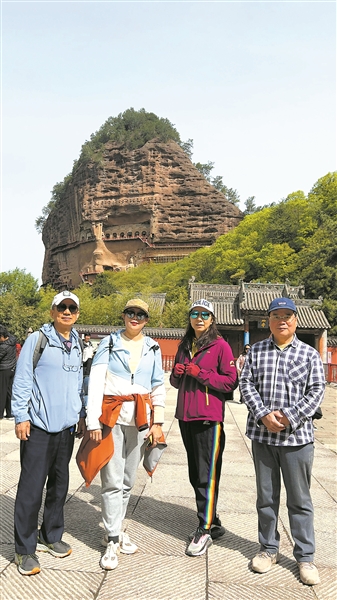 谭叔(右一)和朋友们组团自驾到麦积山游览。