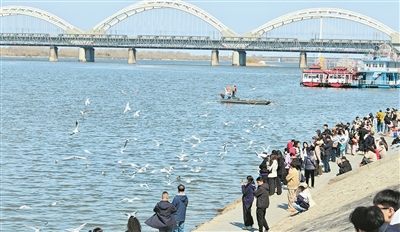 23日中午,防洪纪念塔附近的江面上,数以千计的江鸥正成群结队地翱翔盘旋,它们或俯冲捕食,激起圈圈涟漪,或悠然浮于碧波,随水轻晃,与湛蓝天空和温暖阳光共同构成一幅灵动的春日图景。比“鸥潮”更动人的,是江畔的人潮。除了举着手机满脸惊喜的本地市民,更多是拖着行李箱、带着专业相机的游客。翅膀划破湛蓝,鸣叫唤醒春水,这场始于社交媒体的“千里奔赴”,在江风与鸥影中找到了答案。