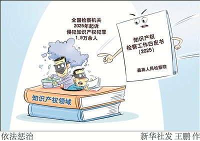 最高人民检察院近日发布的《知识产权检察工作白皮书(2025)》显示,全国检察机关依法惩治侵犯知识产权犯罪,2025年起诉侵犯知识产权犯罪19102人。