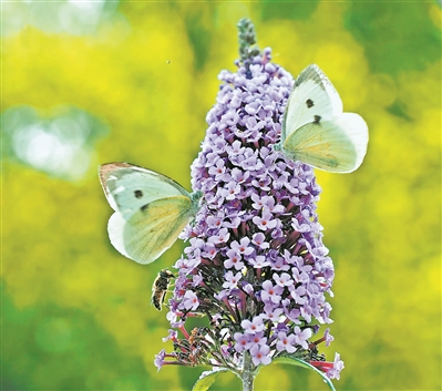 丁香花很香,所以花朵周围经常有蜜蜂和蝴蝶盘旋。可以等蜜蜂和蝴蝶在花间翩翩起舞,抓拍它们振翅飞翔的动感;或者等它们落在花朵上,拍摄它们采蜜的瞬间,会让照片显得生机勃勃。