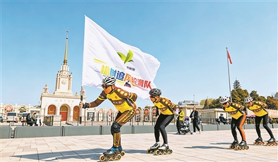 “榆树追风”轮滑队一展风采。 在北京展览馆广场上,总有一群戴着头盔、穿着统一队服、脚蹬轮滑鞋的老人在驰骋。他们时而竞速滑行,时而排练轮滑舞,每个人的脸上都洋溢着活力与笑容,被周边居民亲切地称为“酷酷的轮滑老人”。