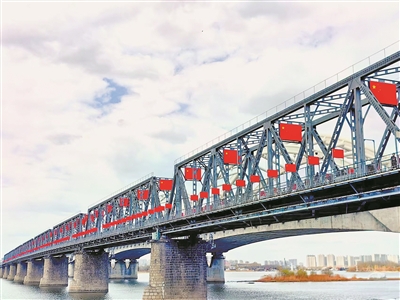一面国旗承载一份信仰,一座老桥镌刻一段岁月。800余面国旗,既是对哈尔滨解放80周年的深情致敬,更是城市红色底蕴与新时代风貌的生动展现。来自河南许昌的游客刘女士与同伴手持国旗,在滨洲铁路桥畔拍照打卡、定格美景。她感慨地说:“这座百年滨洲铁路桥,沉淀着哈尔滨百年发展记忆。致敬为解放哈尔滨奋勇前进的英雄,他们是这个城市的精神脊梁。”她衷心祝福这座英雄之城生机常在,焕发持久的活力与风采。